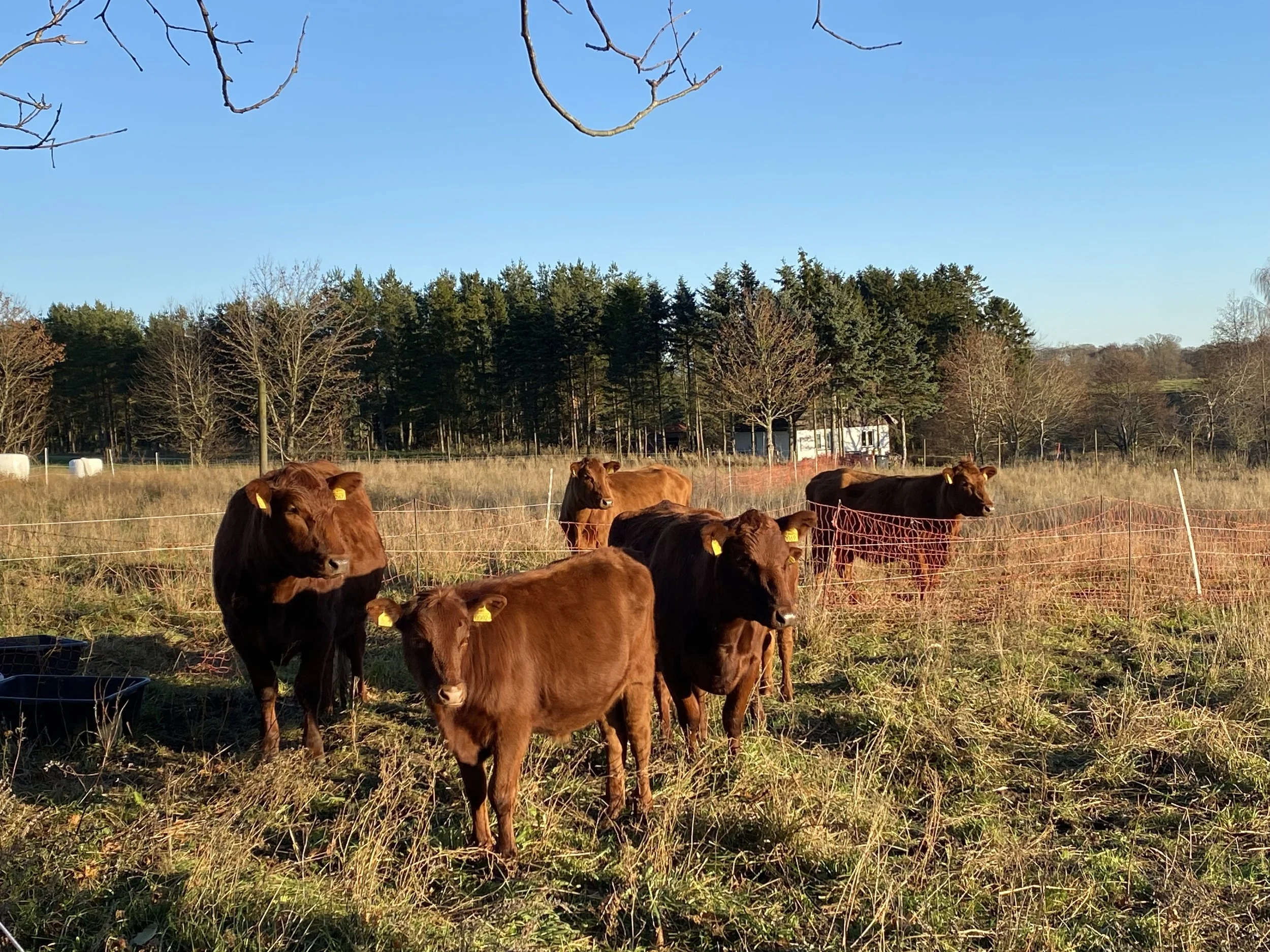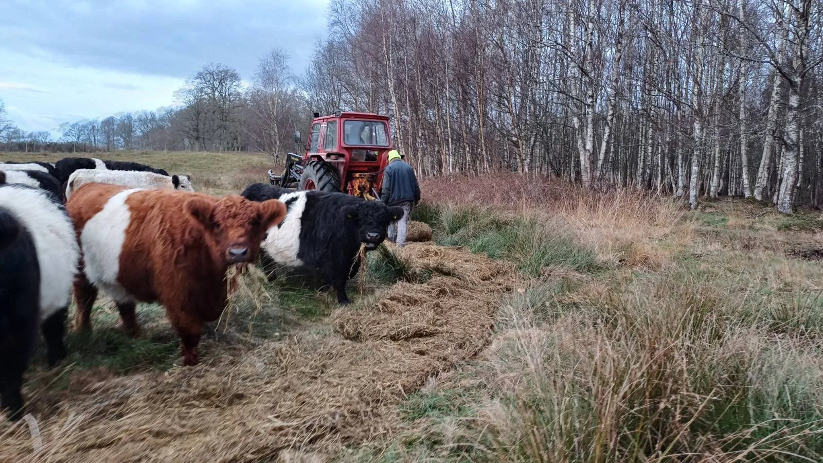 Balutfodring av Belted Galloway-kor hos Raissa Kruse. Balen rullas ut för att ge gott om matplatser, och platsen är vald för att samtidigt trycka tillbaka veketåg. Foto: Anders Assis.
