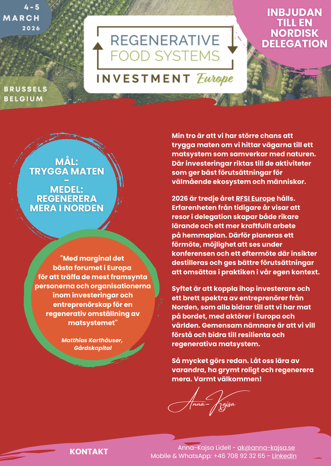 För tredje året i rad är vi en delegation som åker till konferensen Regenerative Food Systems Investment Europe. Jag ser det som helt centralt att vi alla inom den regenerativa rörelsen bubbelhoppar för att förstå vad som händer, och vilka möjligheter som finns att regenerera mera tillsammans. Fram till 16 januari, fast först till kvarn, finns det möjlighet att få ett Farmer Scholarship, vilket innebär att RFSIs partners finansierar själva konferensavgiften. Hade varit fantastiskt att få med bönder från våra nordiska länder.